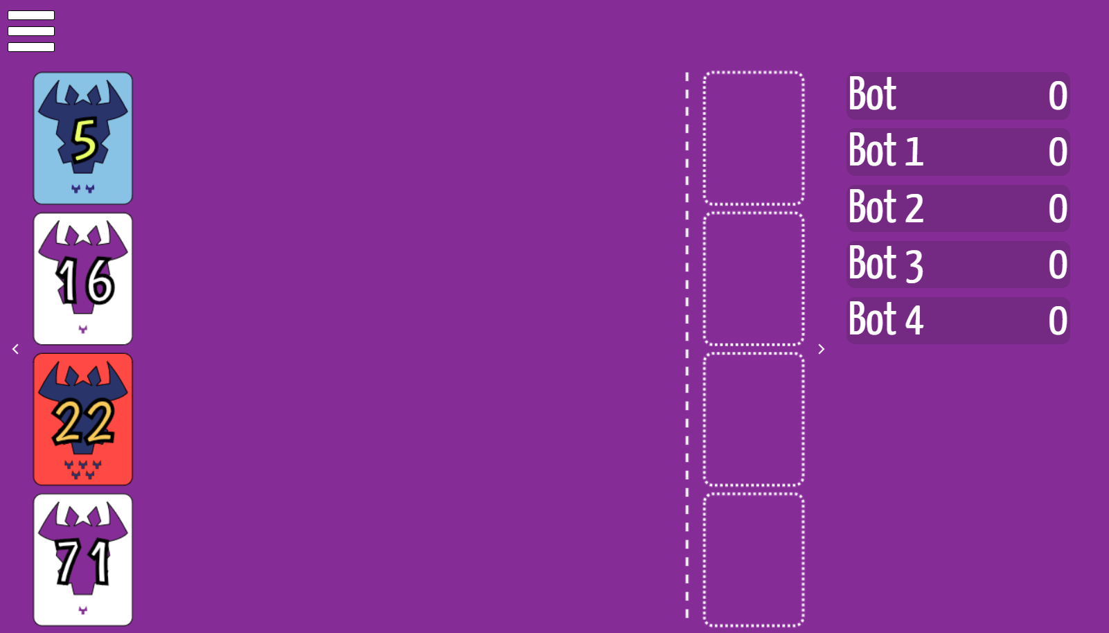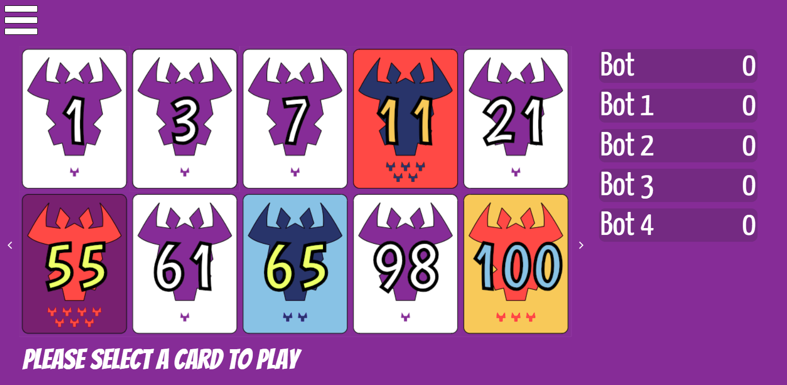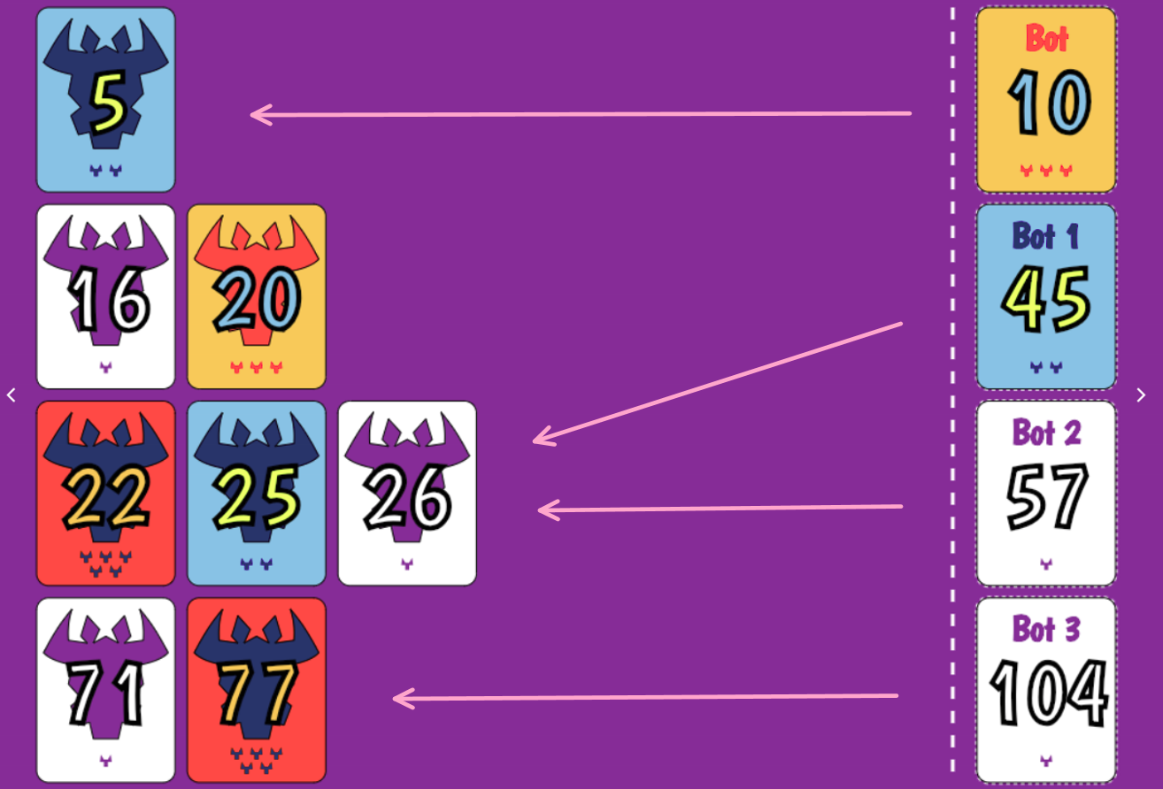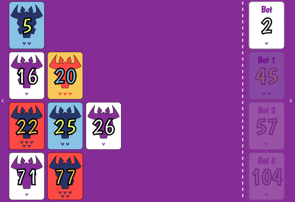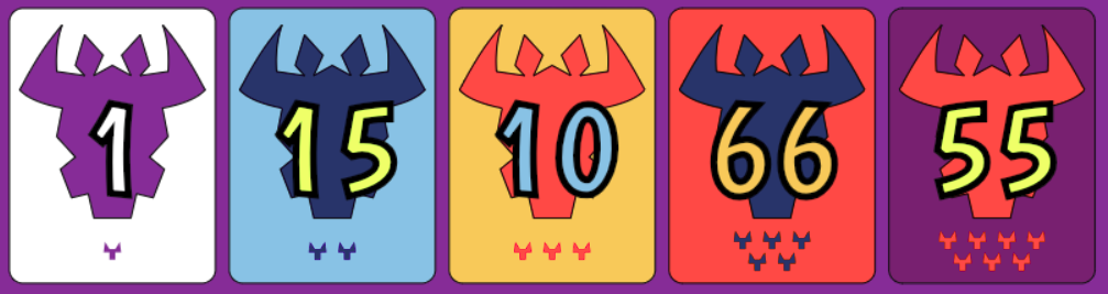 The game is played with a special card deck. There are 104 cards numbered 1-104. Each card has a number of cattle heads on it.