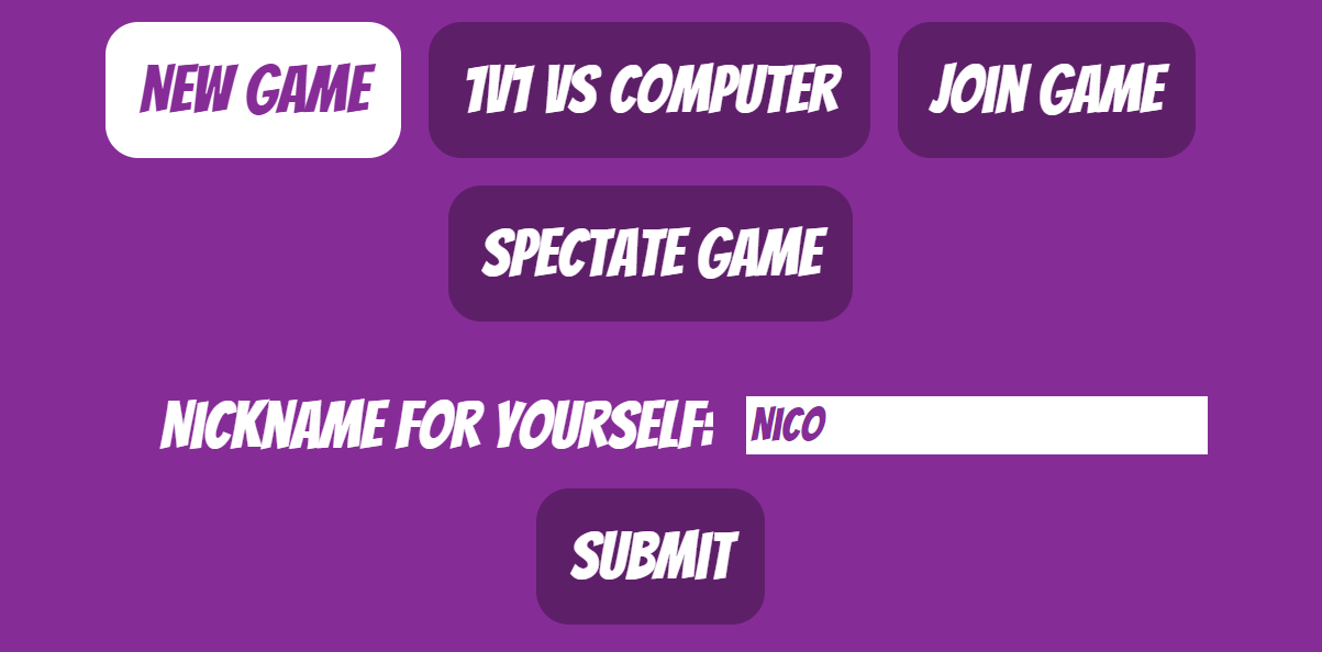 From the home page, one player selects "New Game" and enters a nickname for themselves.